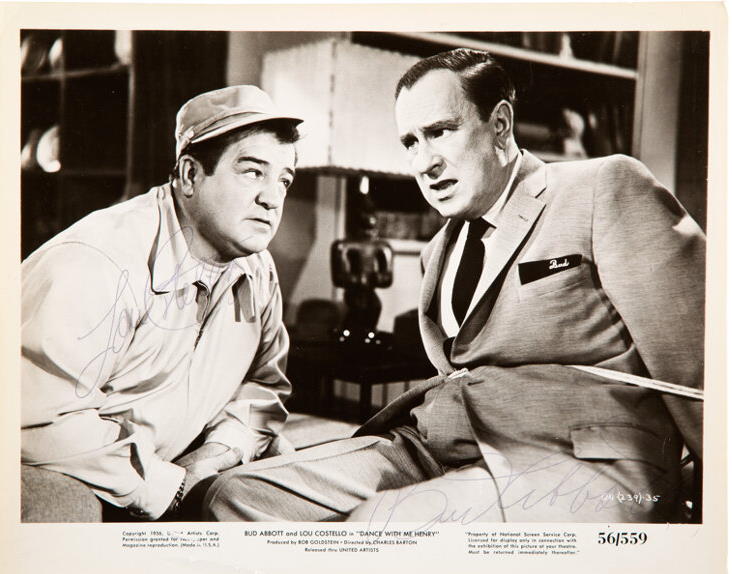 Abbott and Costello Signed Dance With Me Henry Vintage Publicity Promo black and white photo. Sold for $312.50 at Heritage Auctions, May 2022.